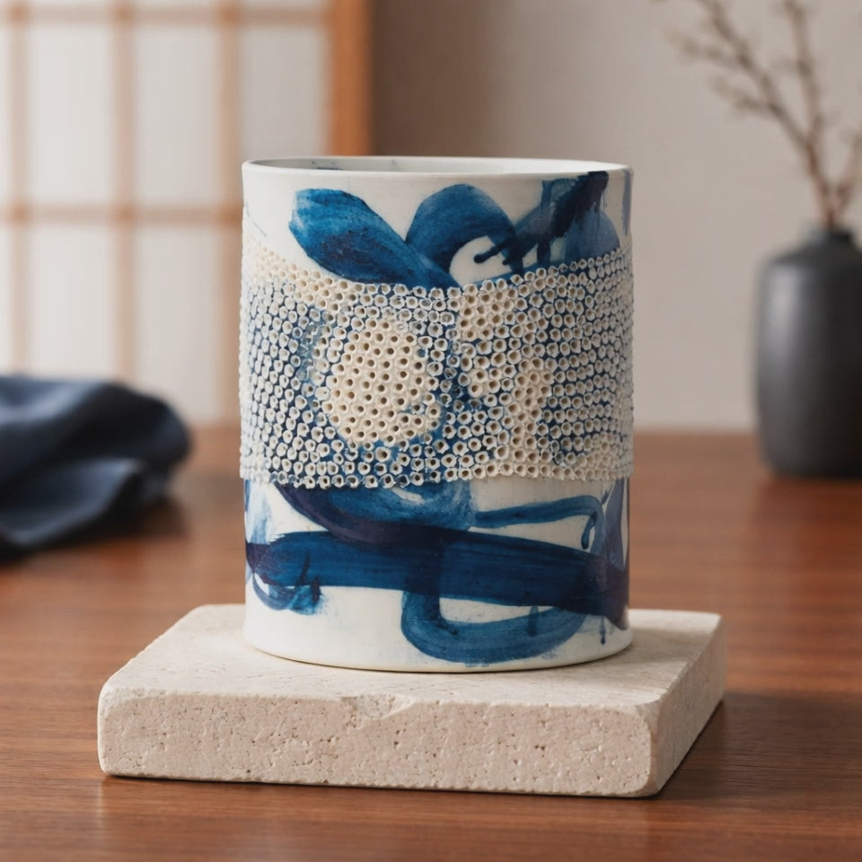 Inlet collection reflects the quiet convergence of river and sea. Hand formed in porcelain and drawn fresh from the kiln, the surface holds impressions of waves, white sand and tidal movement.